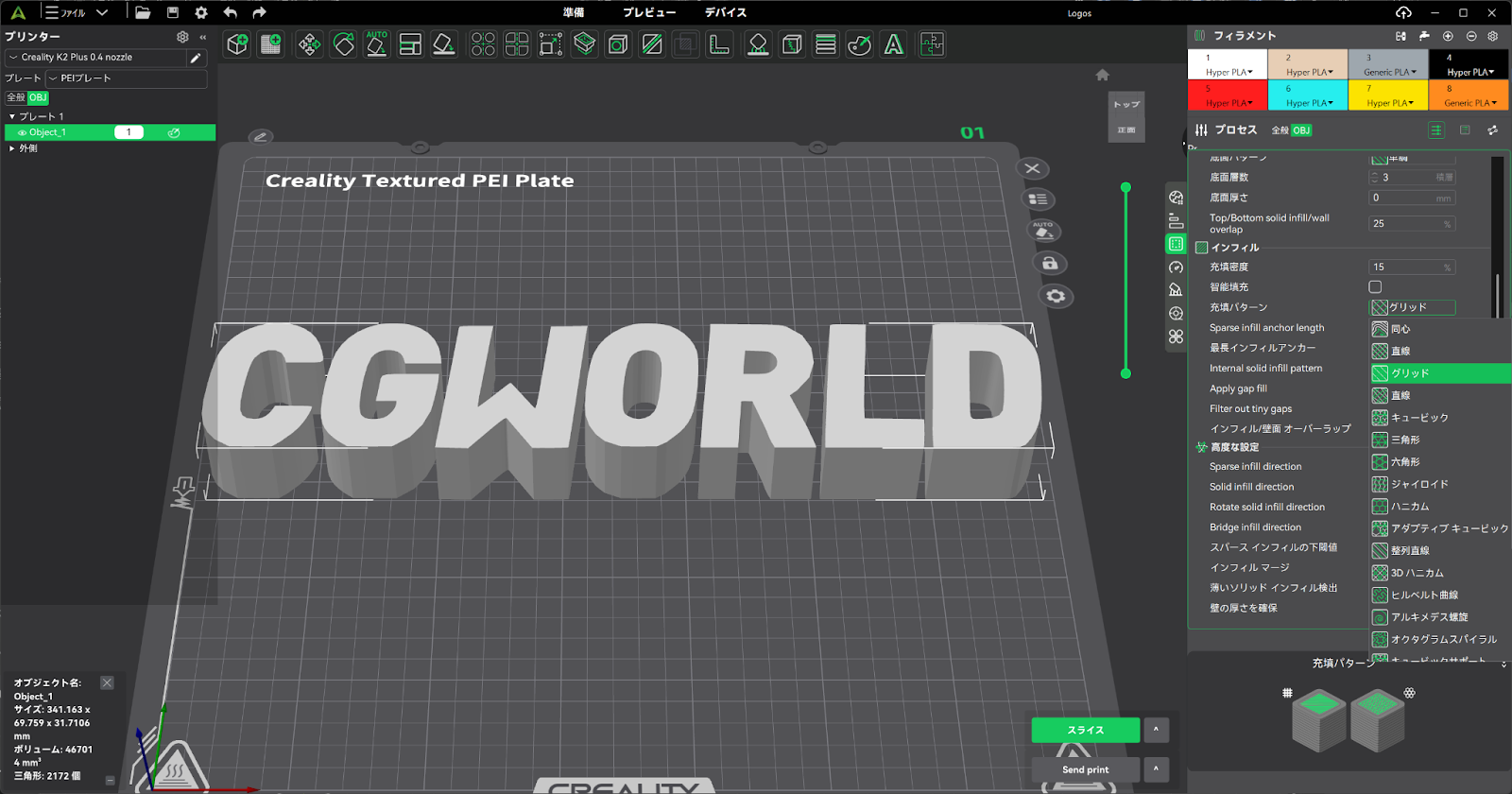 今回は軽量化やフィラメントの節約のために、インフィル率を少し下げました。インフィルとは、出力物の中身をどのように埋めるかという設定です。デフォルトではグリッド(格子パターン)で15%の割合で充填されています。これをハニカム(六角構造)に変更し3%の充填率で出力します。