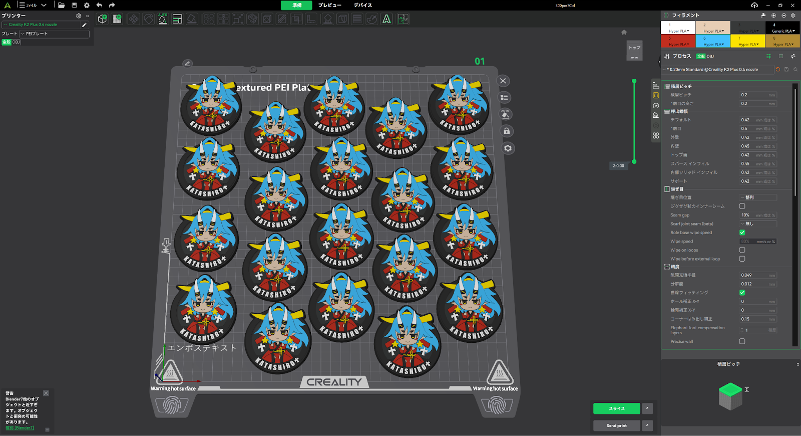 爆速マルチカラーの特性として、印刷速度自体はかなり早いのですが、弱点として色の切り替えに時間がかかります。そのため、同じプロダクトを敷き詰めてプリントすることが、最もフィラメントと時間の短縮になります。